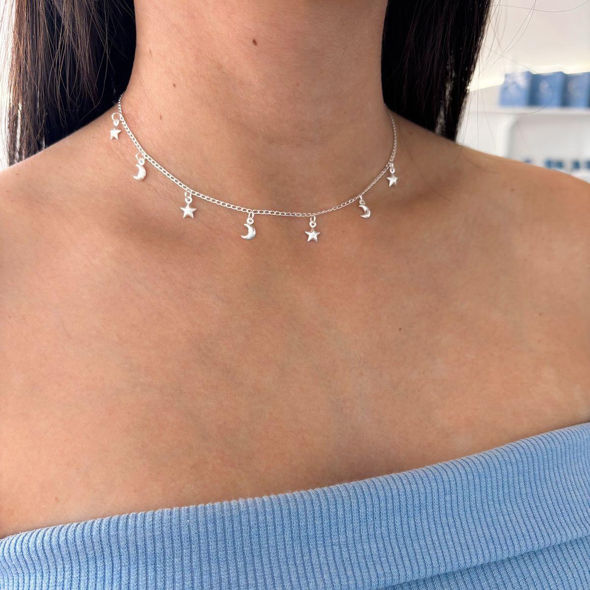 A Choker Céu em Prata 925 é uma joia encantadora que une delicadeza e brilho em uma composição celestial. Com pequenos pingentes inspirados no céu, como estrelas e luas, essa peça simboliza luz, sonhos e boas energias.