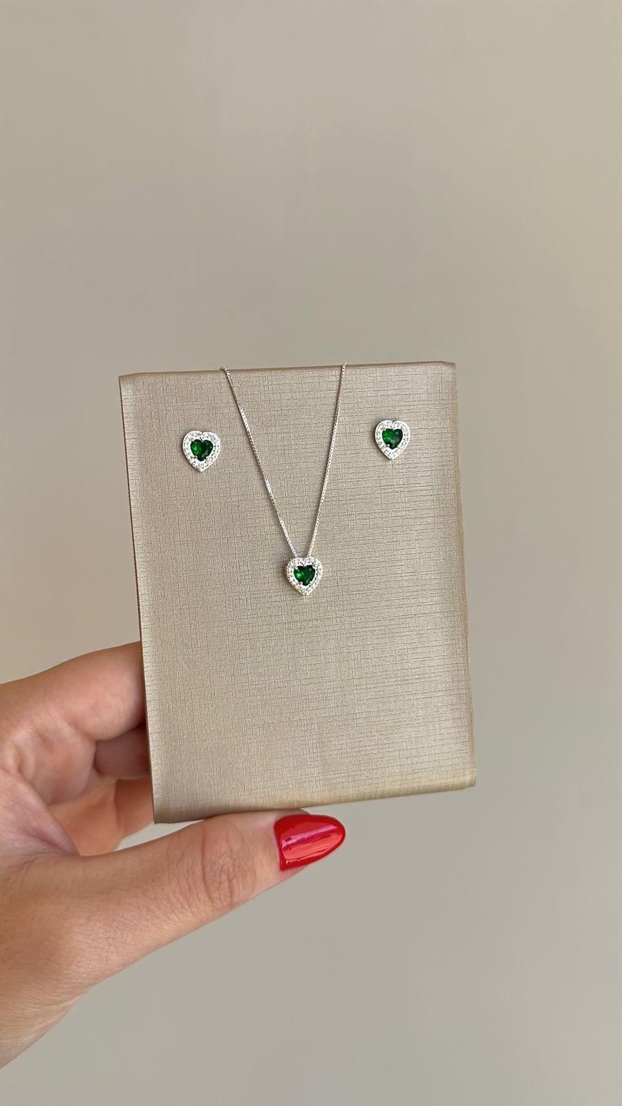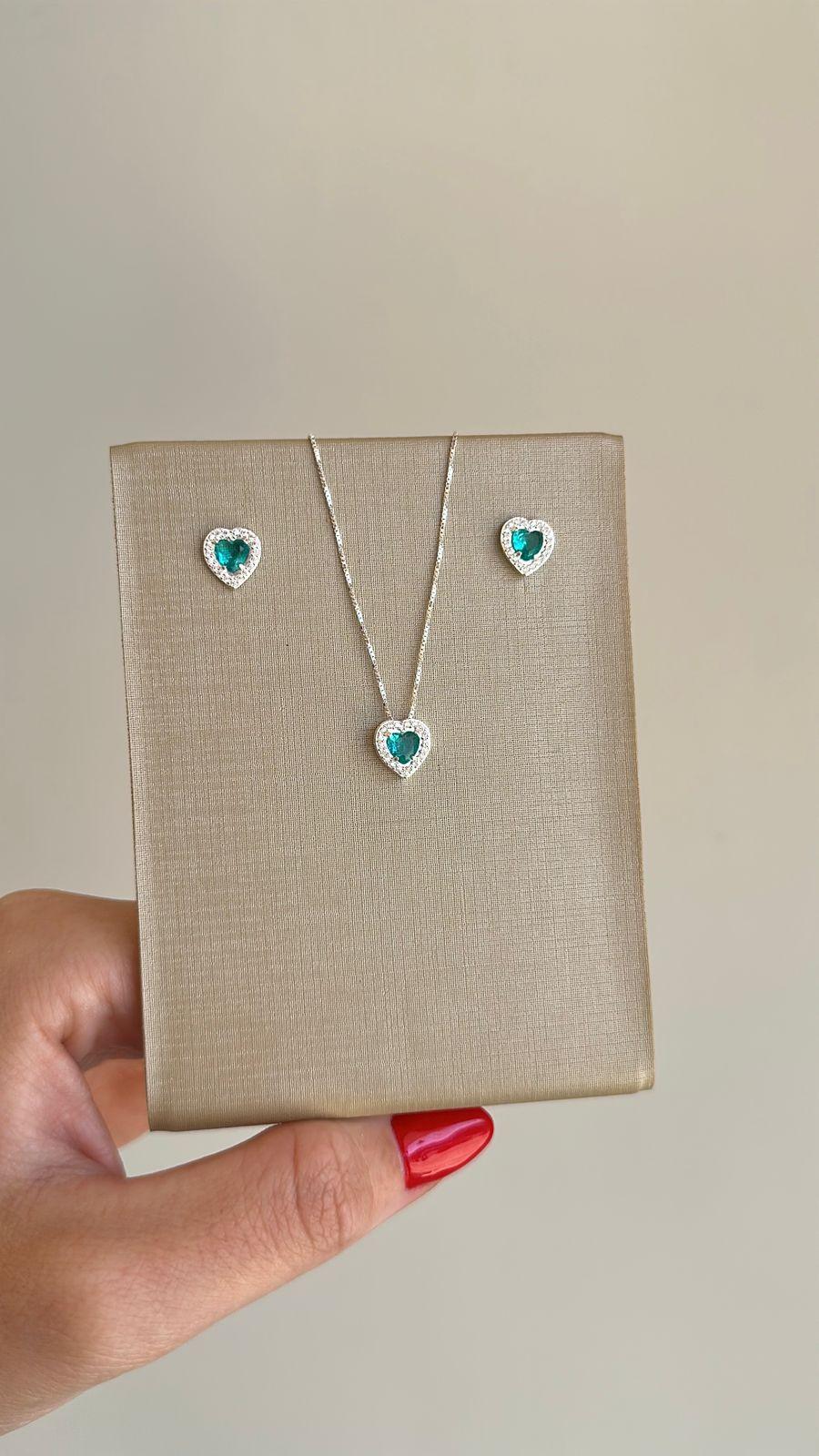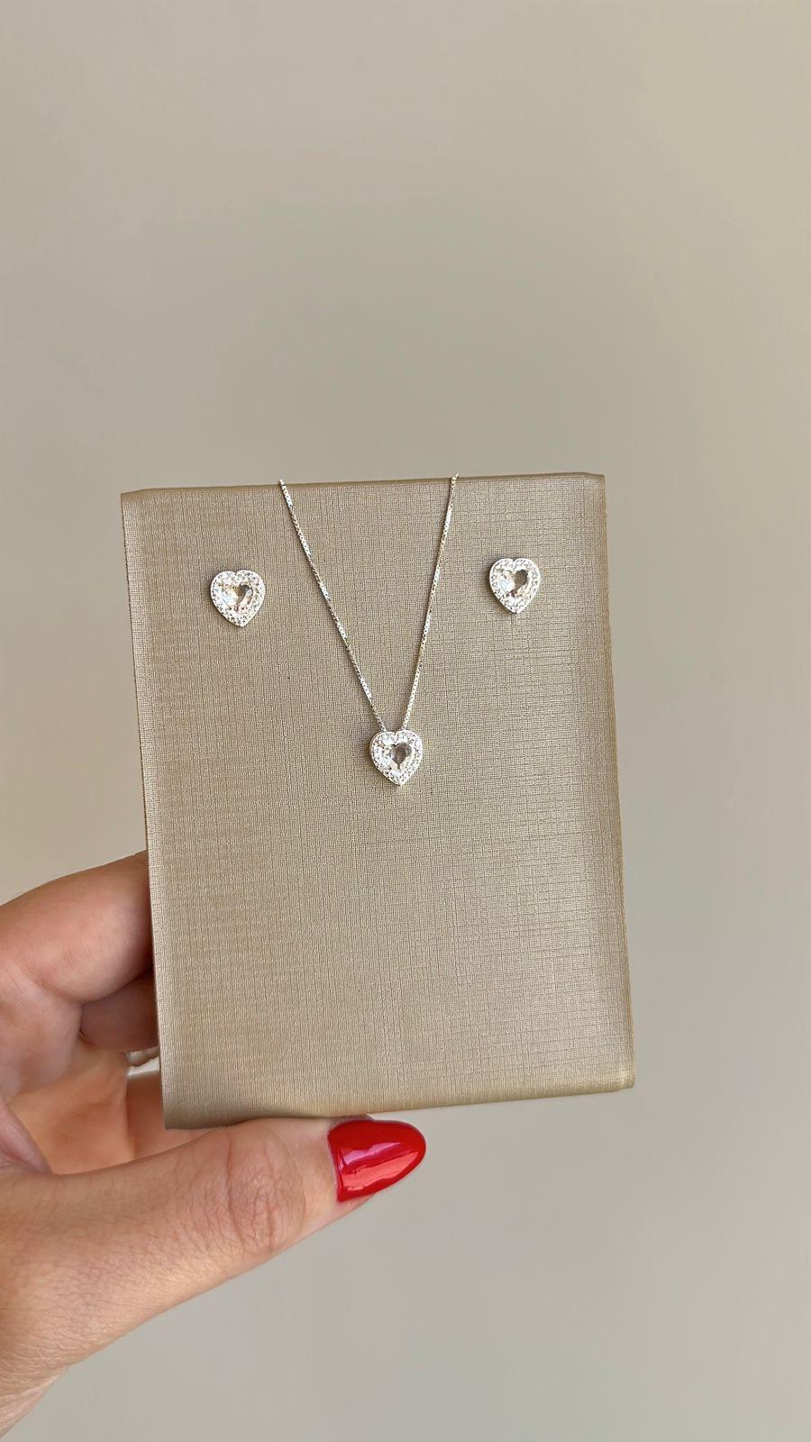 Conjunto Colar e Brinco Cravejado Coração Zircônia Color Prata 925