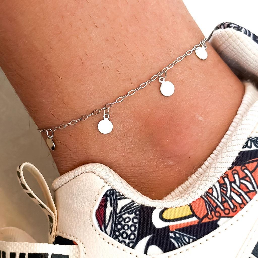 A Tornozeleira Medalha em Prata 925 é uma joia moderna e cheia de estilo. Seu design delicado, com pequenas medalhas lisas distribuídas ao longo da corrente, reflete o brilho suave da prata e traz um toque sofisticado a qualquer produção.